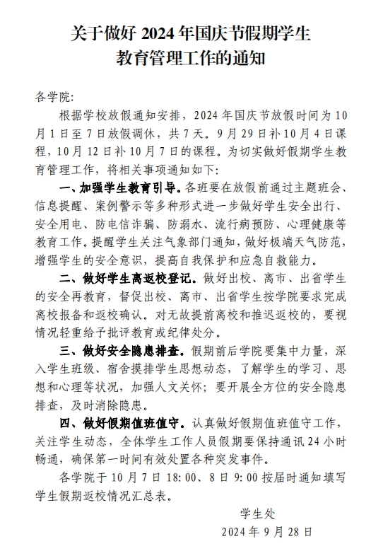 关于做好2024年国庆节假期学生教育管理工作的通知