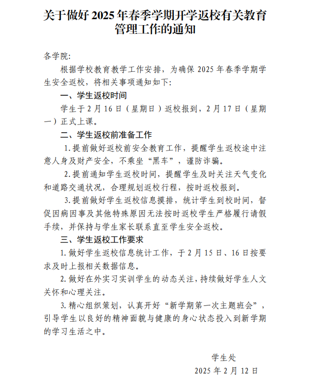 关于做好2025年春季学期开学返校有关教育管理工作的通知