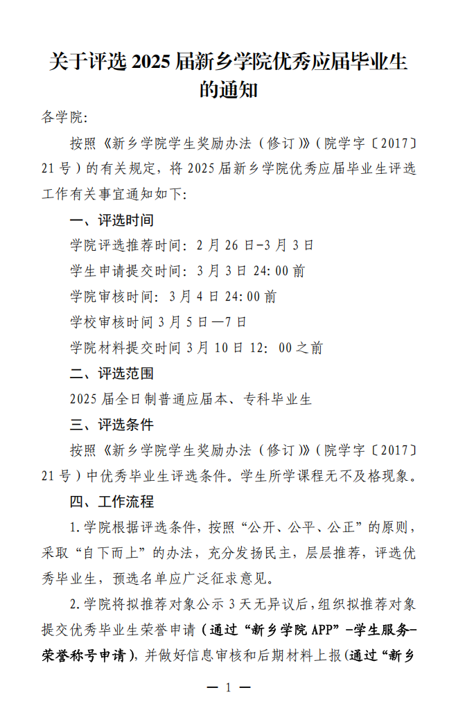 关于评选2025届新乡学院优秀应届毕业生的通知