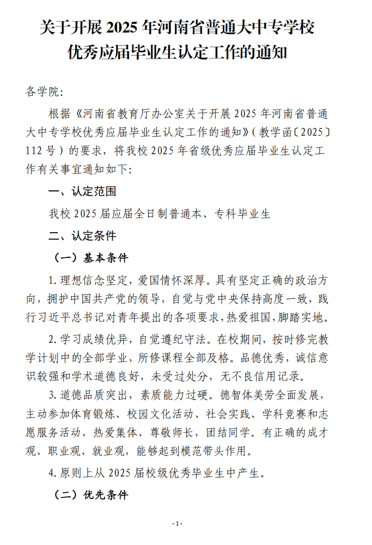 关于开展2025年河南省普通大中专学校优秀应届毕业生认定工作的通知
