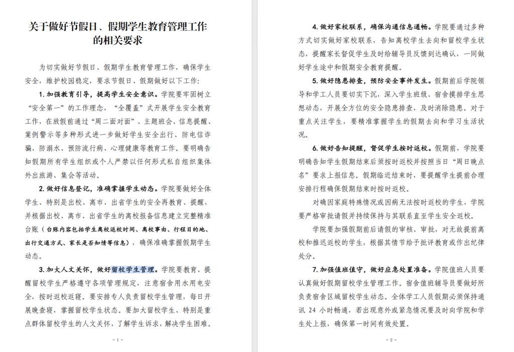 端午假期临近,请按照《关于做好节假日、假期学生教育管理工作的相关要求》相关要求做好学生教育提醒、去向信息摸排、安全隐患排查、留校学生管理、值班值守等工作。