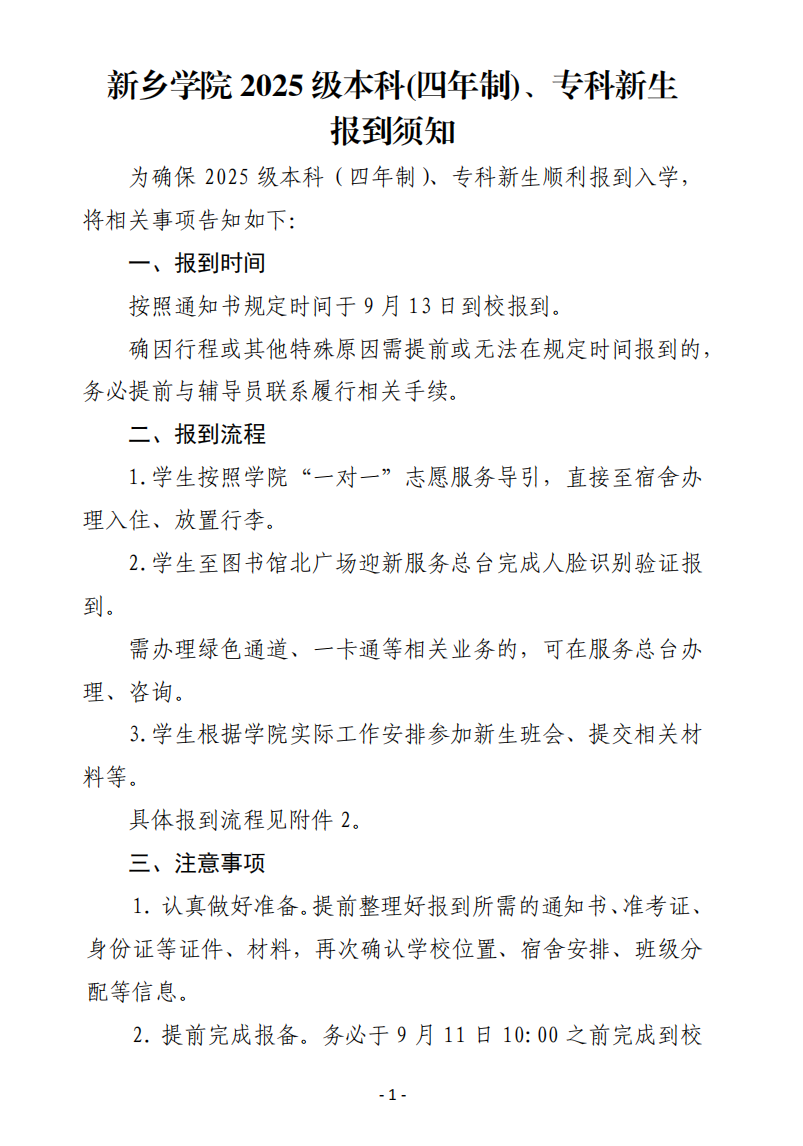 新乡学院2025级本科(四年制)、专科新生报到须知