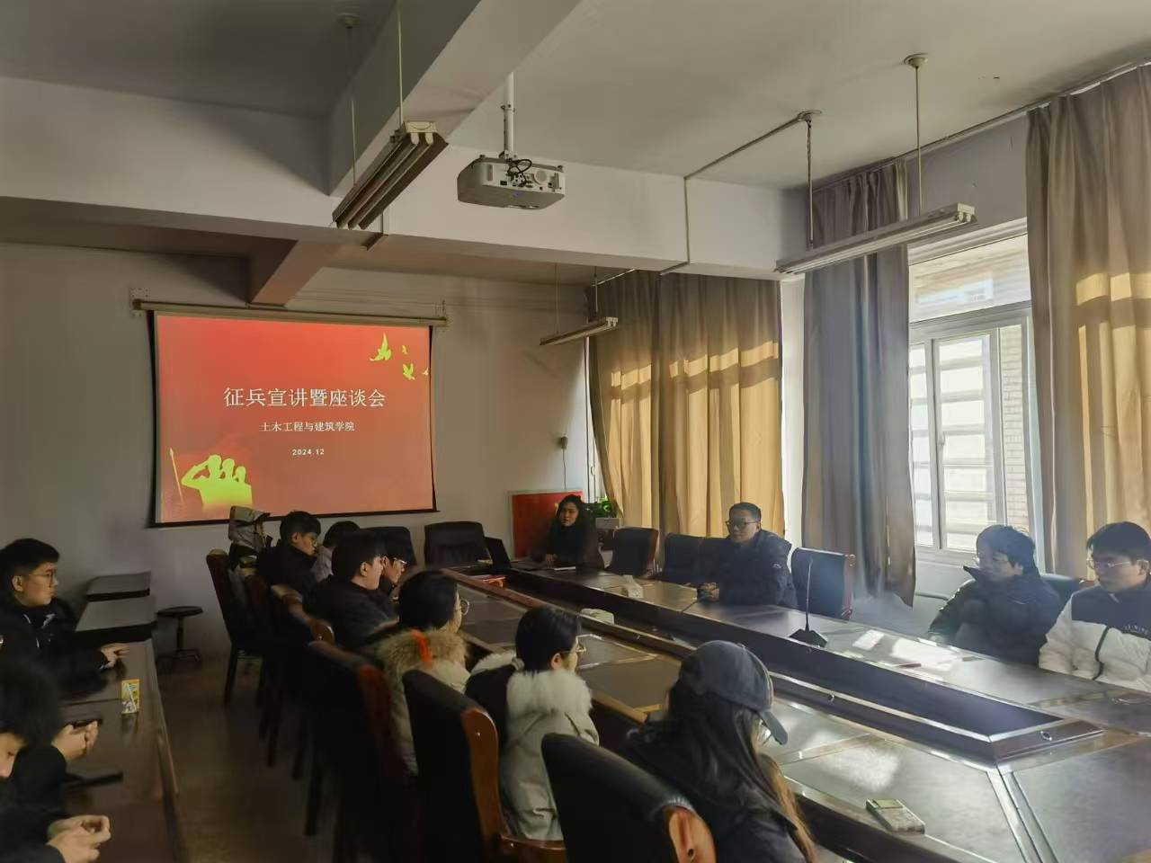 2024年12月23日,土木工程与建筑学院在A09-314会议室举办2025年征兵宣讲暨座谈会,本次会议主要由2025届应届毕业生及有参军意愿的学生参加。活动由土木工程与建筑学院副书记袁大伟主持。