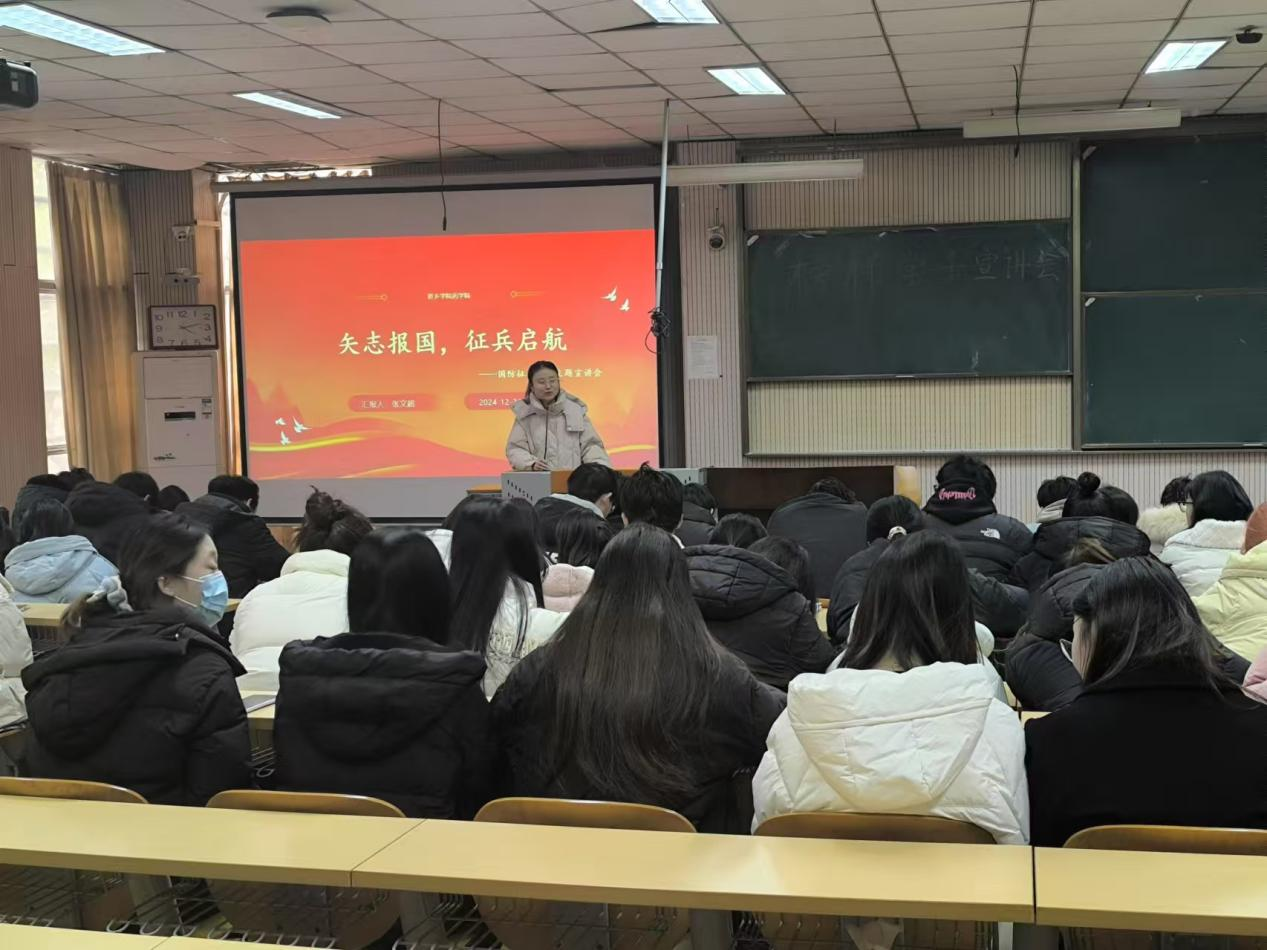 为响应国家号召,积极响应我校开展大学生应征入伍宣传教育工作,进一步增强学生的国防观念,培养我院学子的爱国情怀,药学院于12月15日和24日分别在A11-120和A05-105举办了两场宣讲活动,学院征兵专管员李丹老师首先向同学们详细介绍了入伍条件、服役待遇、退伍安置、升学优惠及就业扶持等方面的征兵政策,其次安排邀请了我院优秀退役军人代表结合亲身经历讲述军旅生活,从艰苦的军事训练到深厚的战友情谊,从个人意志的磨炼到对家国责任担当的感悟。解答了不同时期参军对学业的影响以及薪资待遇方面的政策。通过系列宣讲,同学们更加清晰地认识到了参军入伍不仅是一种义务和责任,更是实现个人价值和成长的宝贵机会。对于25届毕业生来说,入伍为他们提供了一个锻炼自我、提升能力的平台,更有助于他们在未来的职业生涯中更好地适应社会和市场的需求。