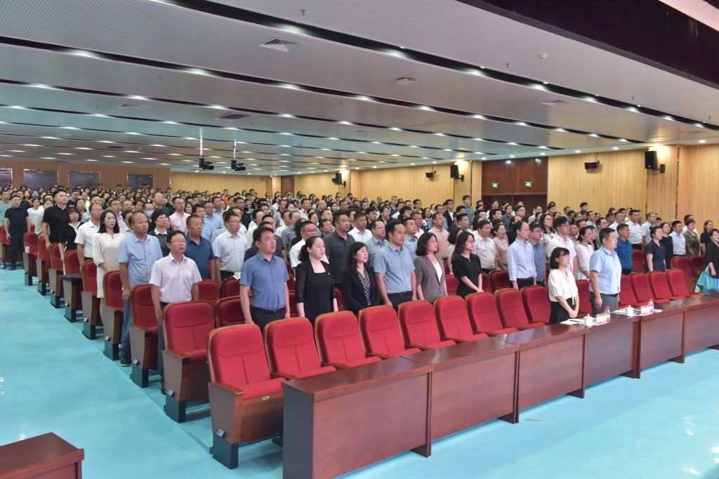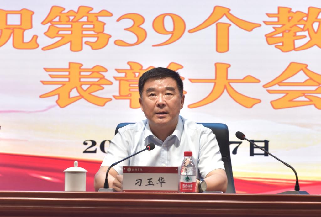 9月7日上午,在全国第39个教师节即将来临之际,我校在行政楼文化艺术中心召开庆祝教师节表彰大会,今年教师节的主题是“躬耕教坛 强国有我”。省教育厅党组成员、副厅长、一级巡视员刁玉华,高等教育处处长、一级调研员张水潮,副处长张小茜,二级主任科员陈庆峰出席会议。全体校领导、获奖教师代表、先进集体代表、先进个人代表、全体中层干部及学生代表参加会议。会议由校长尹新明主持。