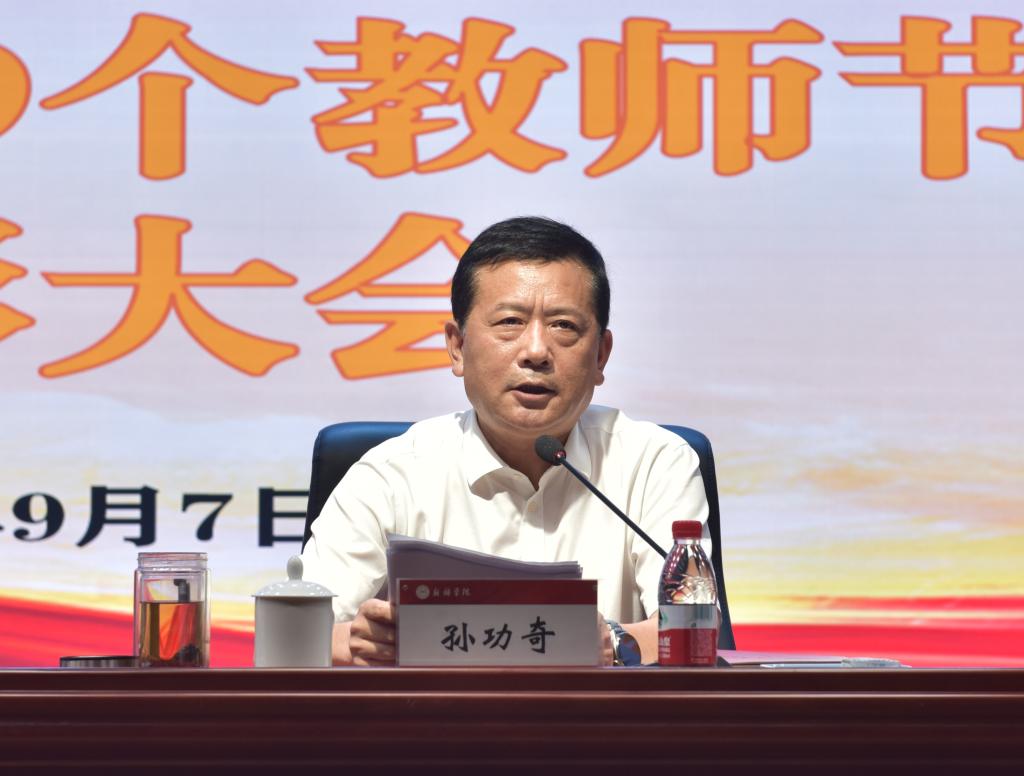 党委书记孙功奇作题为《躬耕教坛育英才 强国有我勇担当》的讲话。他指出,一年来,在省委省政府的正确领导下,在全校上下的共同努力下,学校事业发展呈现良好的发展态势。成绩的取得,凝聚着广大教职员工的智慧和汗水,彰显着新乡学院人的家国情怀、责任担当和对教育事业的无限忠诚。孙功奇对我校广大教师提出四点期望:一要胸怀“国之大者”,不负时代;二要坚持“四有”标准,立德树人;三要坚持“四个面向”,勇攀高峰;四要弘扬“新院精神”,再创佳绩。他强调,传承是最好的致敬,接过前辈学人手中的接力棒,跑出新时代新乡学院“加速度”,这是当代新乡学院人义不容辞的责任。我校即将迎来教育部本科教育教学审核评估,学校内涵建设和外延扩张的任务异常繁重,需要我们弘扬新时代“新院精神”,进一步坚定信心决心,明确目标任务,以“躬耕”的精神、昂扬的状态、扎实的作风,奋力谱写内涵式高质量发展新篇章。