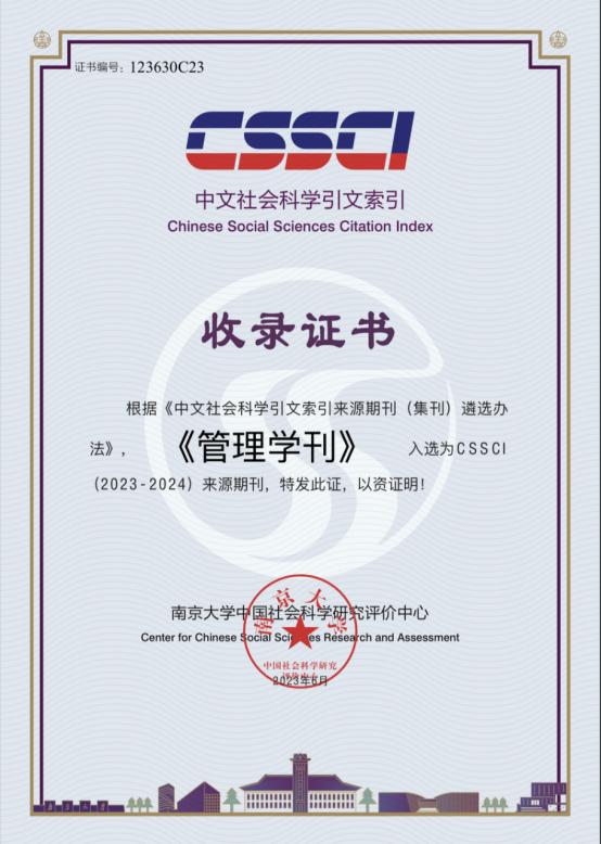 近日,南京大学中国社会科学研究评价中心(CSSCI)发布了CSSCI来源期刊目录(2023—2024),《管理学刊》再次入选CSSCI来源期刊,这是《管理学刊》自2019年首次进入CSSCI来源期刊之后,连续第3次入选CSSCI来源期刊目录。