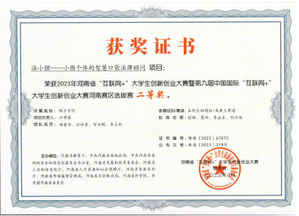 近日河南省教育厅办公室发布了《关于公布2023年河南省“互联网+”大学生创新创业大赛暨第九届中国国际“互联网+”大学生创新创业大赛河南赛区选拔赛获奖名单的通知》(教高函〔2023〕319号)。经过精心组织、特训打磨、赛事选拔,我校《“法小狸”——小微个体的智慧口袋法律顾问》荣获二等奖,这也是我校在此项比赛的新突破。