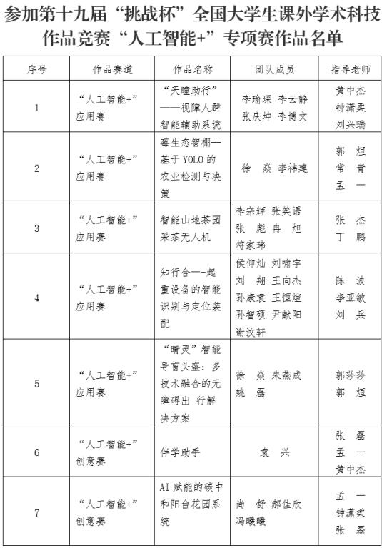 按照第十九届“挑战杯”全国大学生课外学术科技作品竞赛的工作提示要求,经各参赛队伍申报、学校审核等环节,拟推荐以下作品参加第十九届“挑战杯”全国大学生课外学术科技作品竞赛“人工智能+”专项赛,现将作品名单(排名不分先后)予以公示。