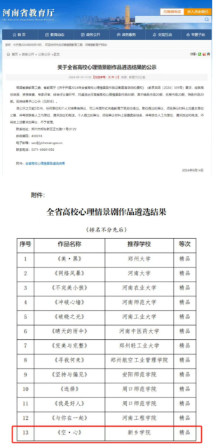 近日,河南省教育厅公示了全省高校心理情景剧作品遴选结果,经各高校申报、资格审查、专家评审、综合评议等环节,共遴选出河南省高校心理情景剧作品60部,其中精品作品20部、优秀作品20部、特色作品20部。我校报送的心理情景剧作品《空·心》荣获河南省高校心理情景剧精品作品。