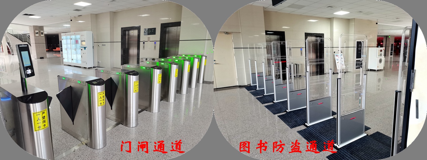 进入图书馆大门后,从门闸通道处刷校园卡进入。出图书馆时,从图书防盗通道出图书馆。